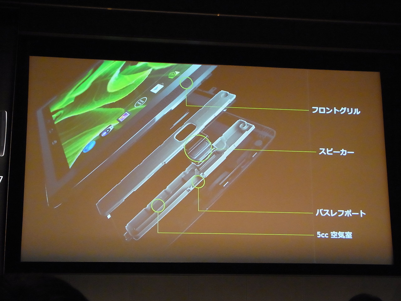 それは、5ccの空気室を設けるという大容量のスピーカーをフロント側に2基設置し、映像やゲームを体験しているユーザーへ直接音を届けるそうです。実際に体験してみましたが、他社タブレットに較べても大きな音を感じることができました。