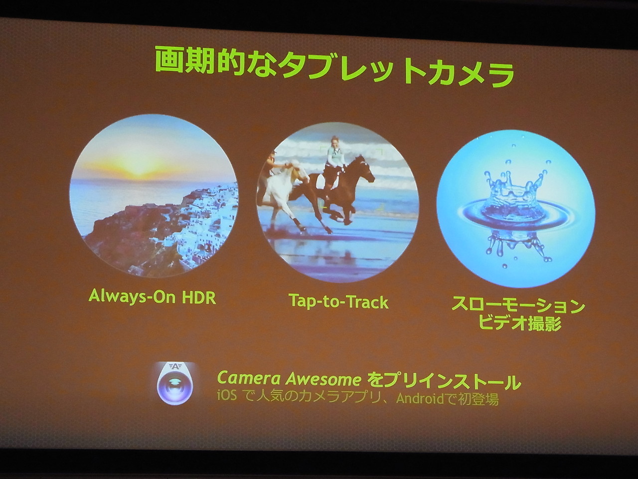 続いて、タブレットには初めてプリインストールされたカメラアプリの「Camera Awesome」が紹介されました。Tegra Note 7には500万画素のリアカメラが搭載されていますが、カメラとチップセットのTegra 4の性能を組み合わせることで非常に高い効果を得ることができるそうです。