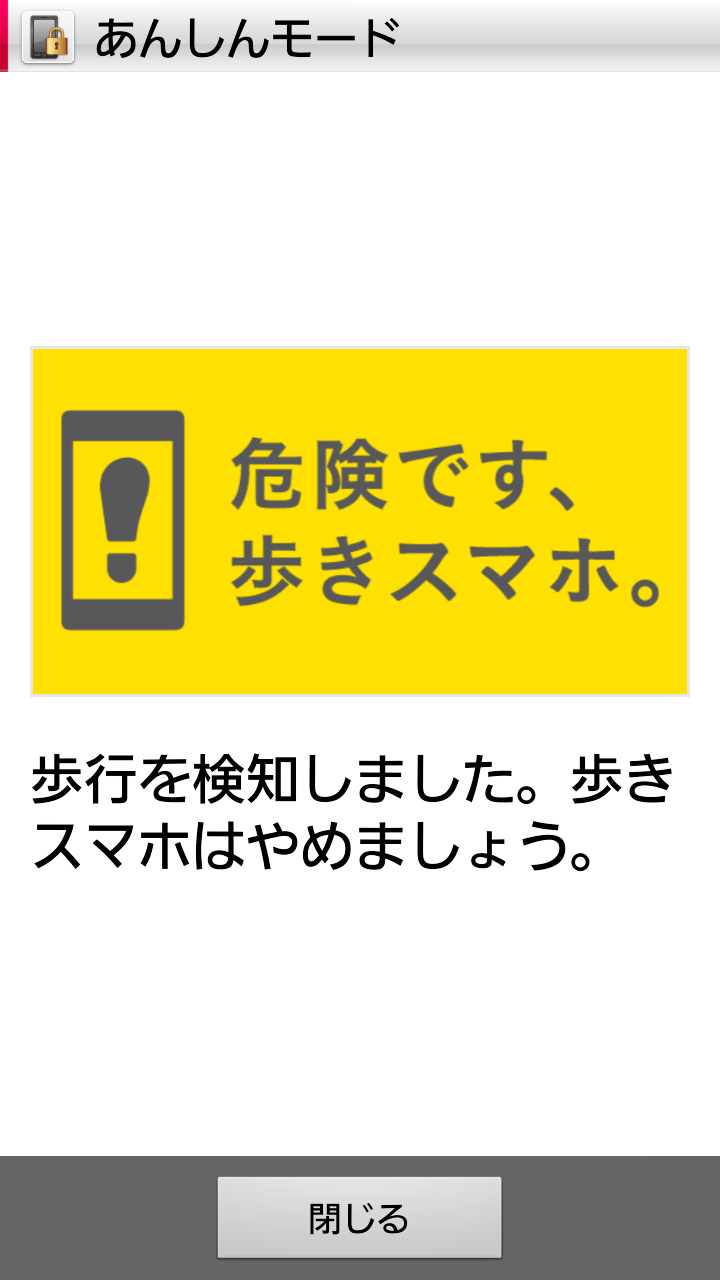 以上のような結果となりました。歩きながらスマホなどを操作しようと画面を見ると、操作不可になる画面が表示されます。ただし、これも立ち止まったり、閉じるボタンを押せばすぐに解除できますが、いちいち画面が出るとやめたくなるのは確かです。自分で入れるというケースはあまりないとは思いますが、お子さんなどに歩きスマホをさせないというケースは十分に考えられそうです。
