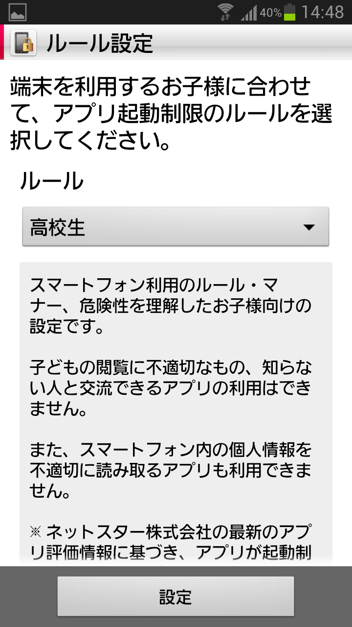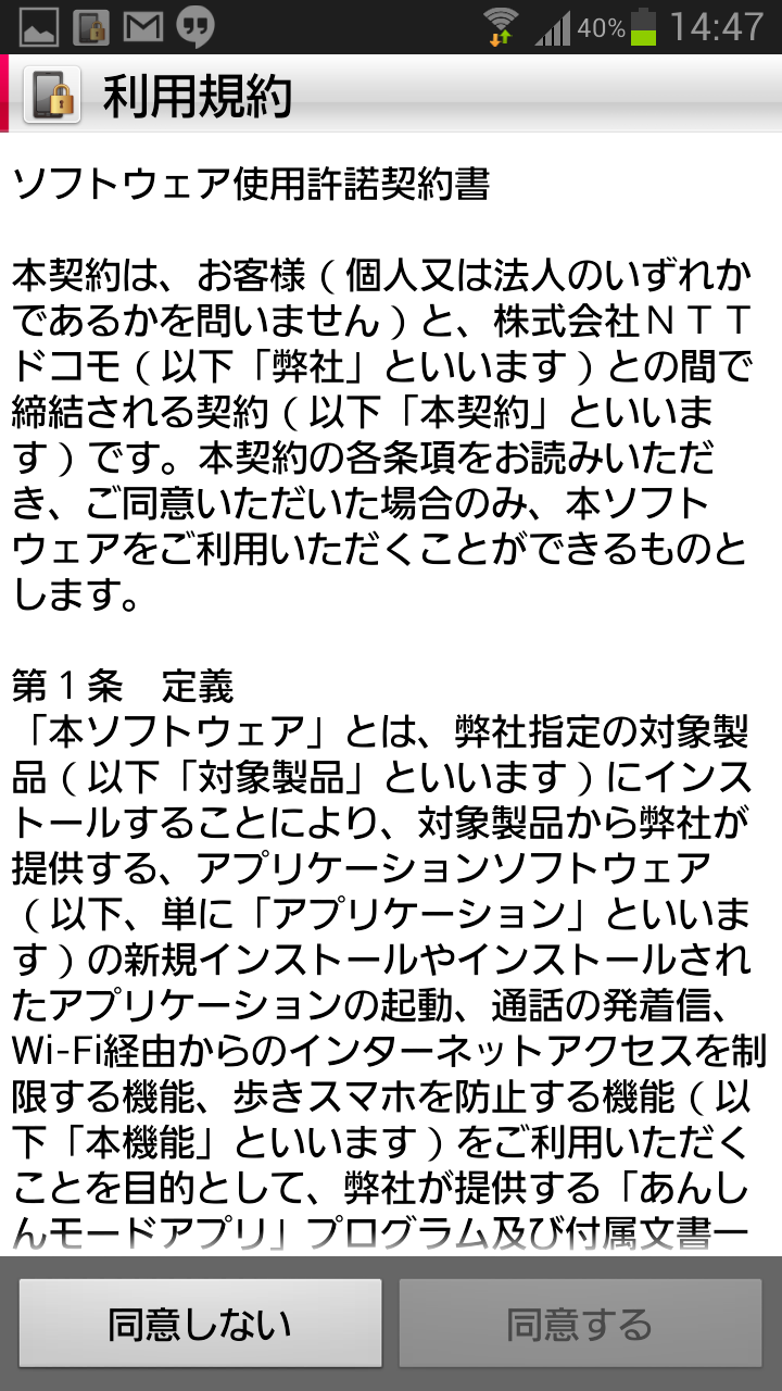 まずはサクッとインストールして、歩きスマホ防止機能を有効にします。手順は上のようになります。あんしんモードは親が子供にスマホなどを持たせるときに機能制限を行ったりできるアプリなので、ルール(小学生・中学生・高校生)やEMA制限などの設定があります。