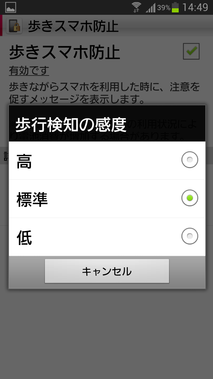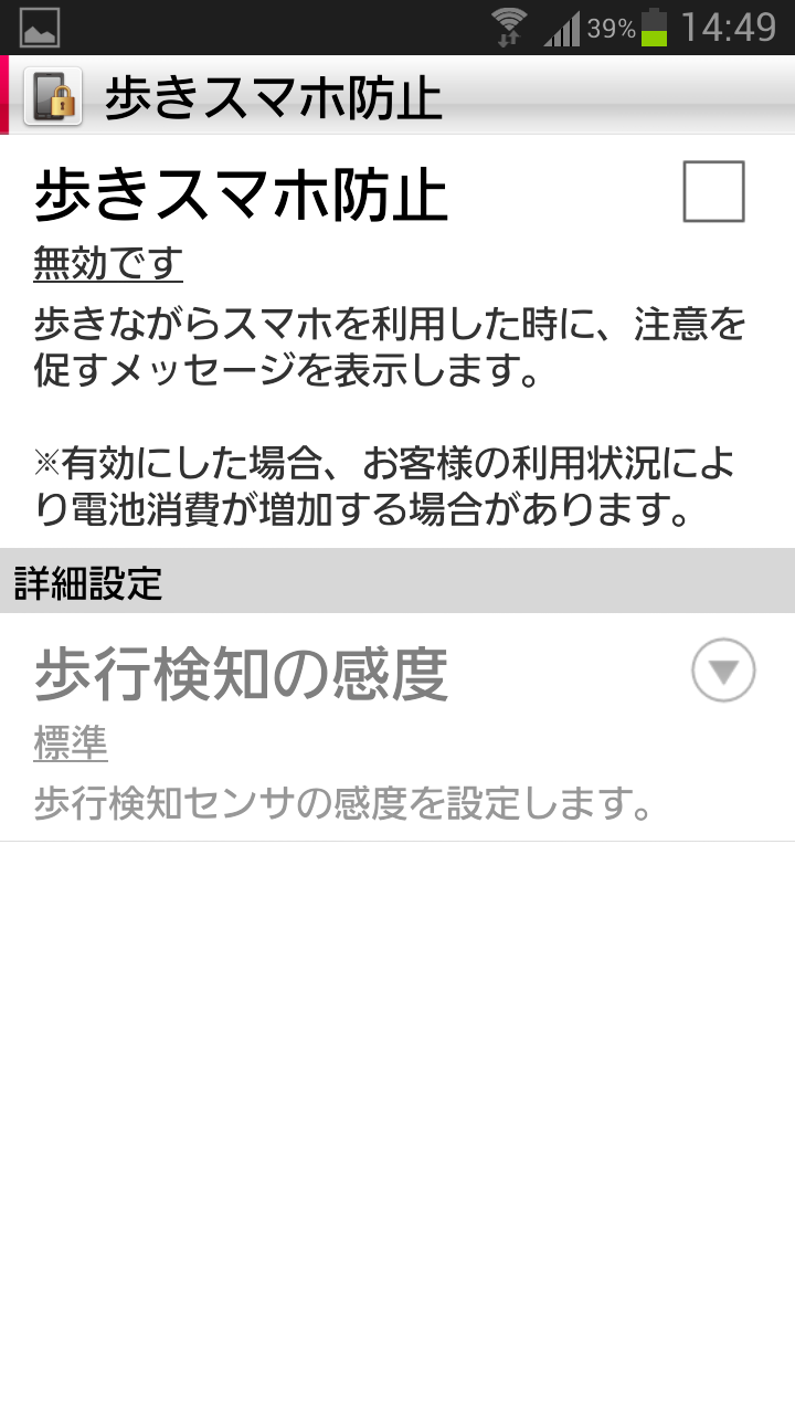 インストールして起動すると、はじめは歩きスマホ防止機能は無効になっていますので、有効にします。