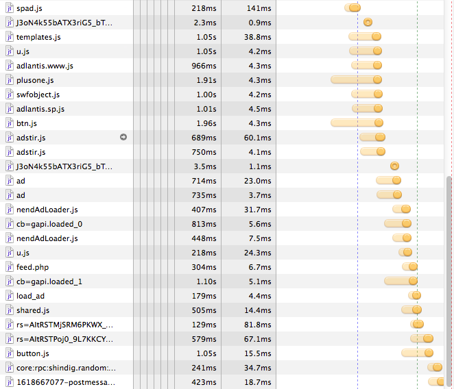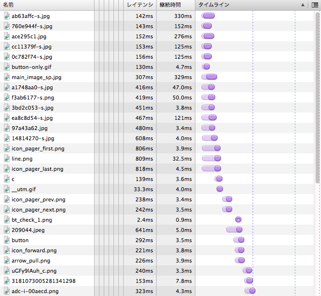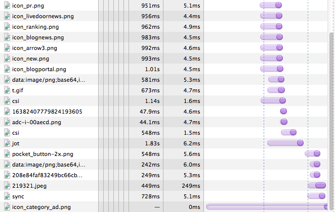 一方で画像ファイルは一気に数が多くなり全部で48個あります。また意外なところでは、Webページに動的な振る舞いを与えるプログラム(JavaScript)ファイルが55個読み込まれていました。ファイル名から推測すると、JavaScriptファイルの多くは広告表示を行うもののようです(*2)。