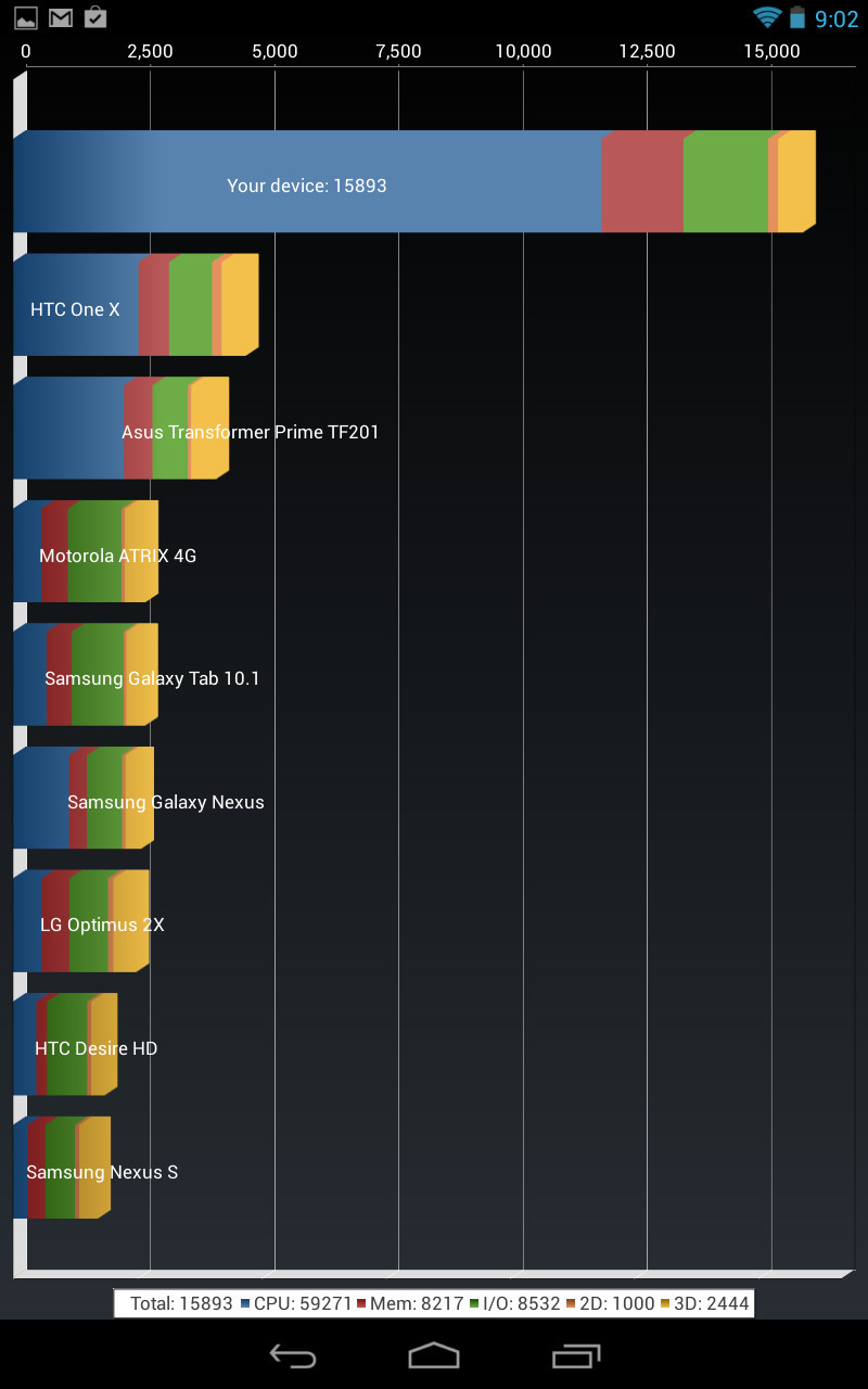 AnTuTu Benchmarkは処理速度やメモリだけでなく画像処理などの総合点で測るベンチマークなのですが、本機においては3D処理のGPUスコアだけで9000点以上、マルチタスク処理で7000点以上という一部の評価点において非常に高いスコアを叩き出しています。