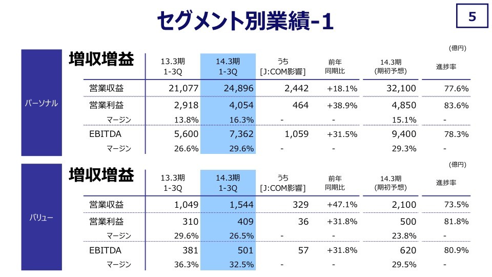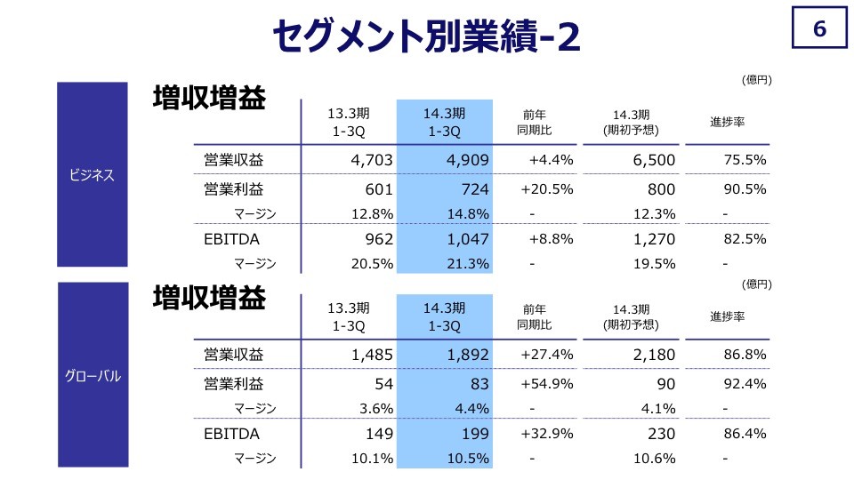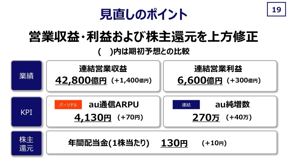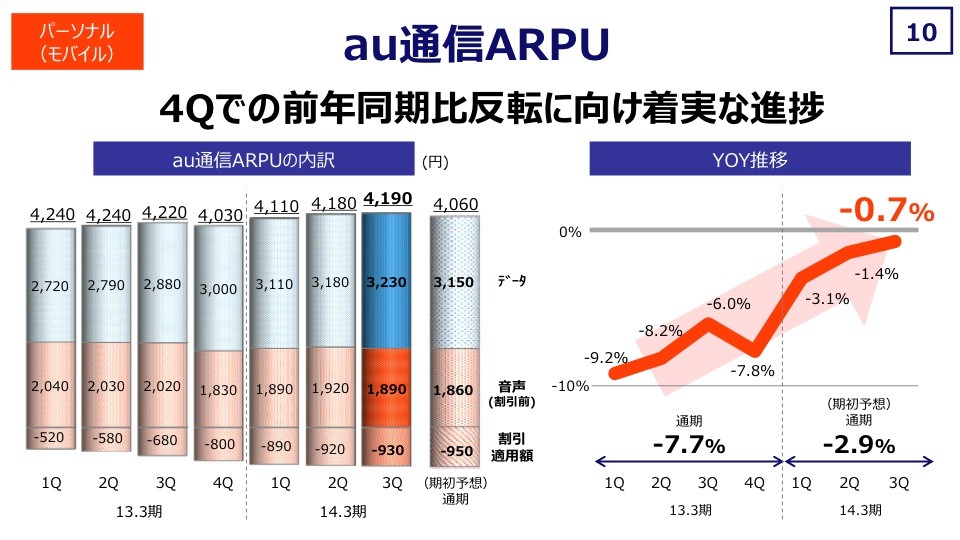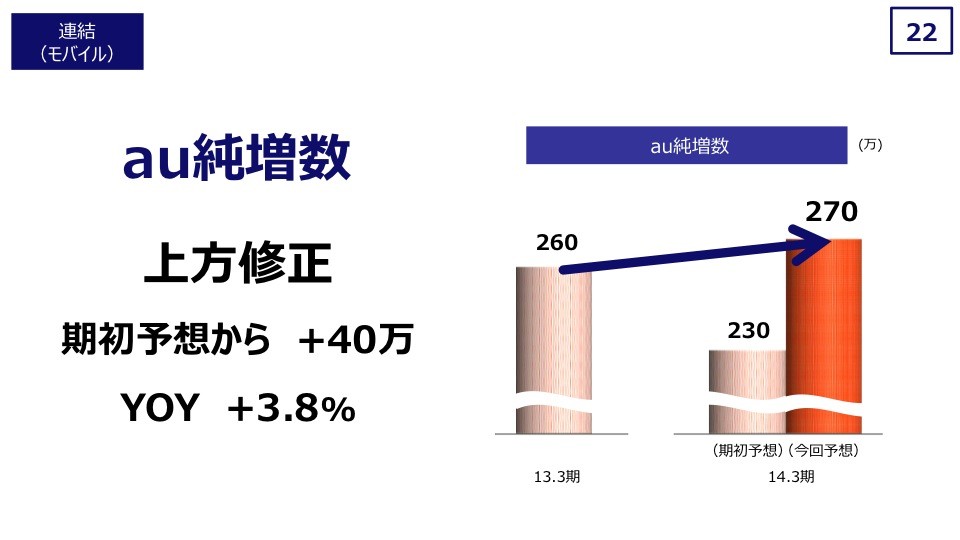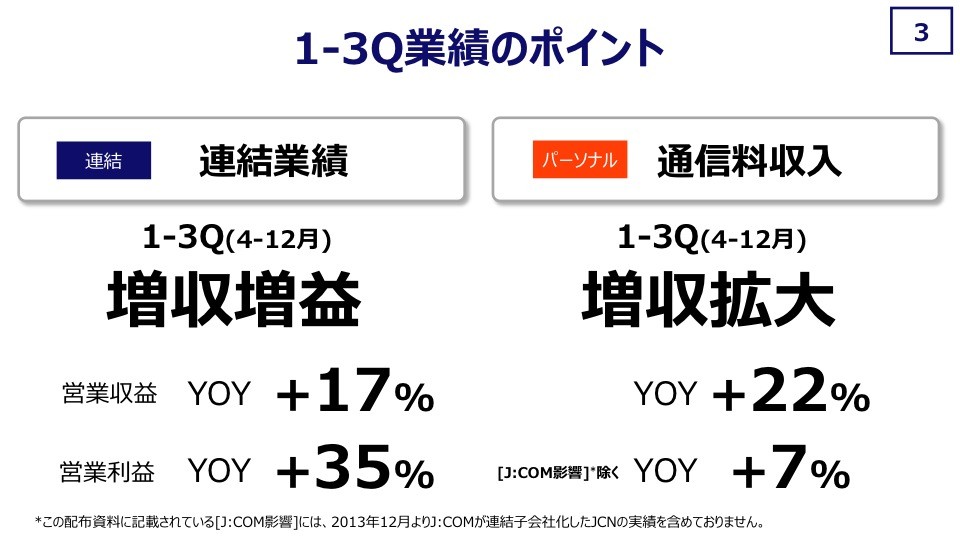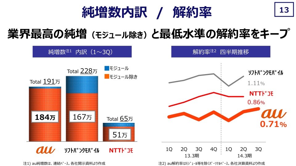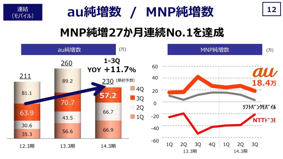 第1四半期から第3四半期では2013年度で営業収益3兆1,799億円(前年比17%増)、営業利益5,332億円(前年比35%増)となり、増収増益となっており、通期業績予想もそれぞれ上方修正し、純増数やARPUも予想を上乗せしています。