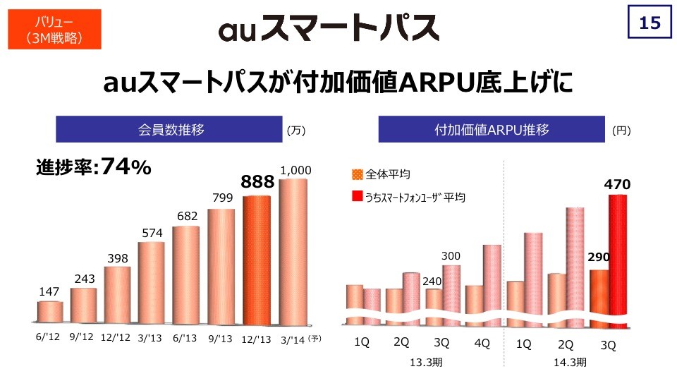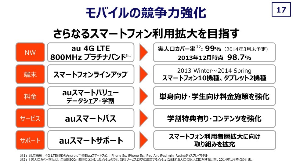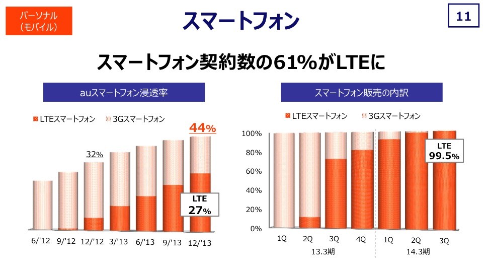 この他、ARPUはデータが3,230円、音声が1,890円、割引適用額が930円。auスマートパスが押し上げているとのこと。スマートフォン浸透率は44%で、販売している99.5%がLTEモデルで、スマートフォン比率のうちのLTE対応モデルの割合が61%にまで到達。