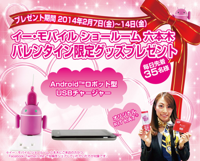 ・イー・モバイル ショールーム 六本木 バレンタイン限定 ピンクのUSBチャージャーとオリジナルKIT KAT®をプレゼント!| イー・モバイル