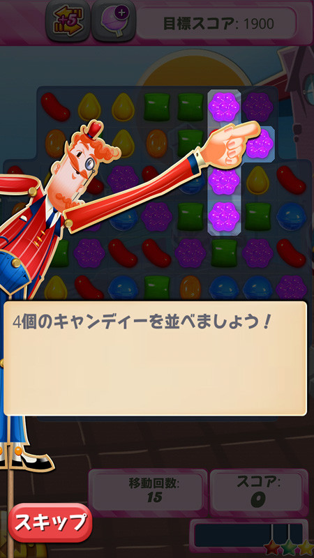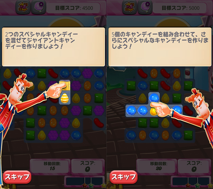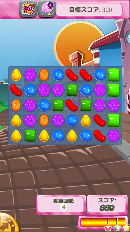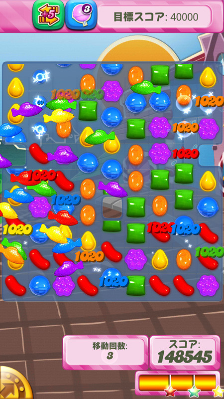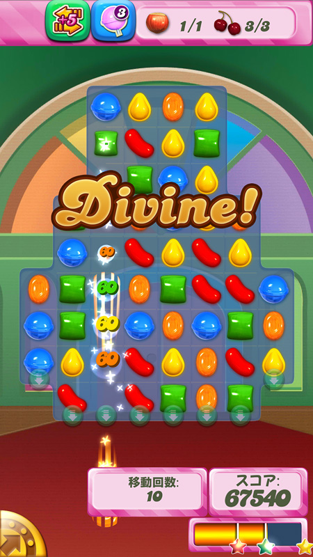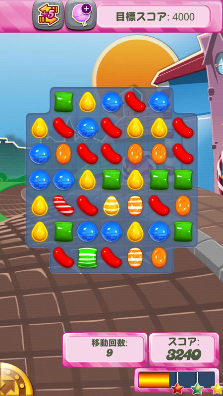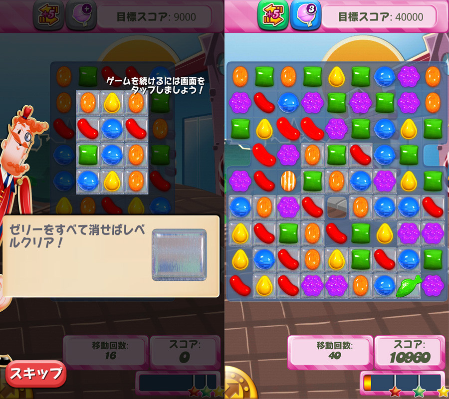 さまざまなキャンディーの効果を駆使して挑むステージは前半はスコアを競うシンプルなものから、複雑な形状に変化するステージにキャンディーを使って指定されたゼリーを消すステージやキャンディーの材料を落とすステージなど盛り沢山。条件が変わるだけで遊び方も変わるのがこのゲームの奥の深さ。