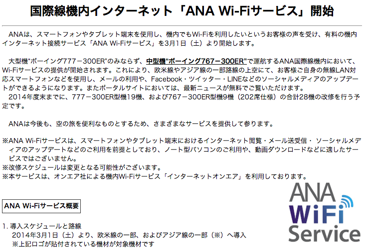 | ANAが国際線機内でWi-Fiサービスを3月1日から提供! |