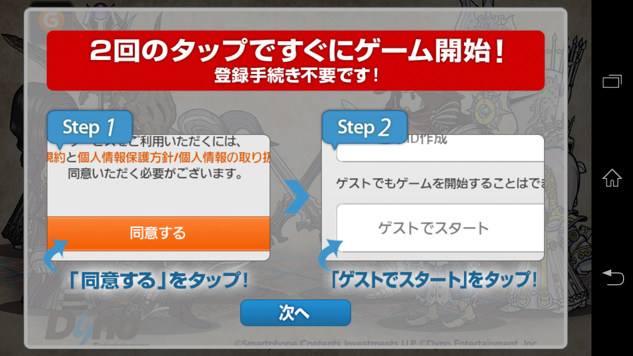 アプリをインストールして、初回起動時に、すぐプレイできる旨のアナウンスが表示される。ハンゲームのアカウントを作成してプレイするタイプのゲームだが、ゲストアカウントとしてプレイすることが可能だ。ただし、機種変更などをした場合、プレイデータを引き継ぐためには、ハンゲームのアカウントを作成する必要があるため、ゲーム開始前にあらかじめアカウントを作成しておくとよいだろう。