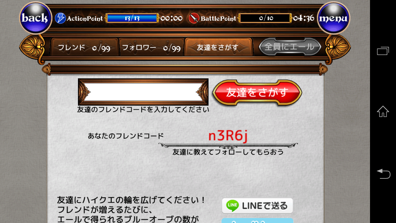 「menu」→「フレンド」→「友達をさがす」から友達をさがしたり、自分のフレンドコードを確認したり、LINEやTwitterでフレンドコードを伝えることも可能だ。