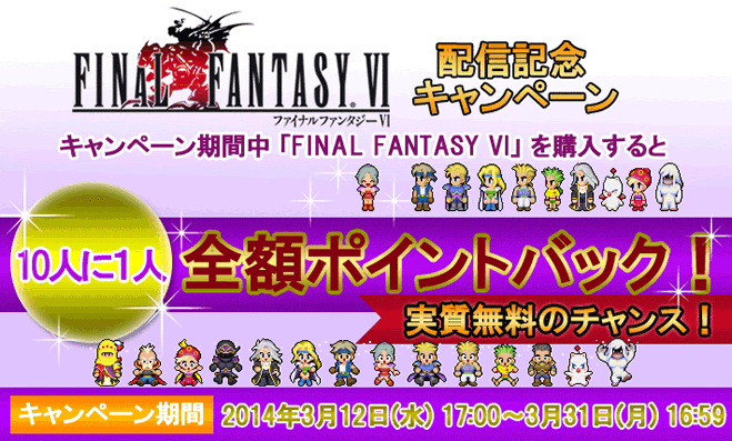 期間中に同サイトで「ファイナルファンタジーVI」を購入した方の中から抽選で10人に1人にファイナルファンタジーVIの購入ポイントと同額の1800ポイントをプレゼントするというものです。購入した時点で自動的にエントリーされ、すぐに当選者の抽出とポイントの付与が行われます。当選した場合には「マイページ」にその旨が記載されます。キャンペーン期間は2014年3月12日の17時から3月31日16時59分まで。