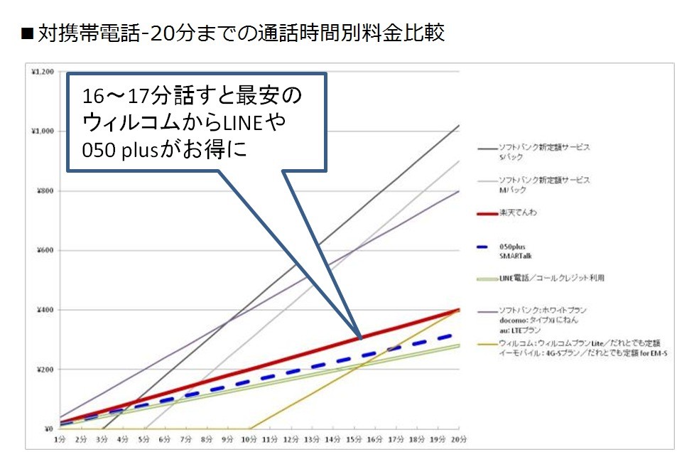 グラフを見てみるとソフトバンクの「新定額サービス」は、20分も話せば、同社のホワイトプランで通話するよりも高くなる。さらに通話料節約サービスと比較したものを見るとSパックでは4~4分30秒超で、すでに「LINE電話」「050 plus」「SMARTalk」よりも通話料が高くなっている。