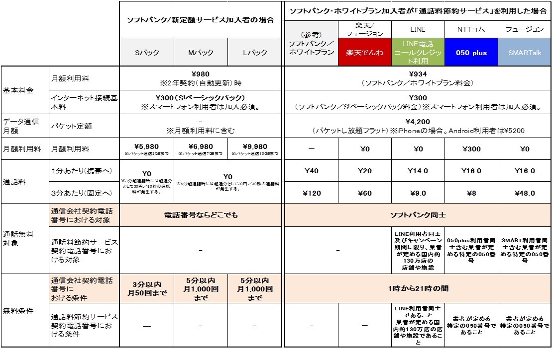 さらに注意したいのが、相手先が同じソフトバンクのユーザーであっても、新定額サービスでは、制限を超えた超過分は無料にならない。対してホワイトプランでは、1時から21時の間、ソフトバンク同士であれば無料通話できる。ということで契約について以下にまとめた表を載せておく。これを念頭に入れておいてもらいたい。