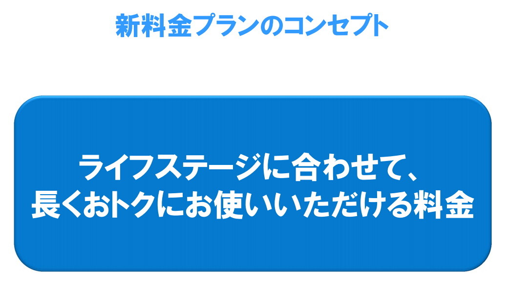 新料金プランのコンセプトは、「ライフステージに合わせて、長くおトクにお使いいただける料金」としており、長期ユーザーを、また今後長期間利用してもらうことを意識したコンセプトになっている。