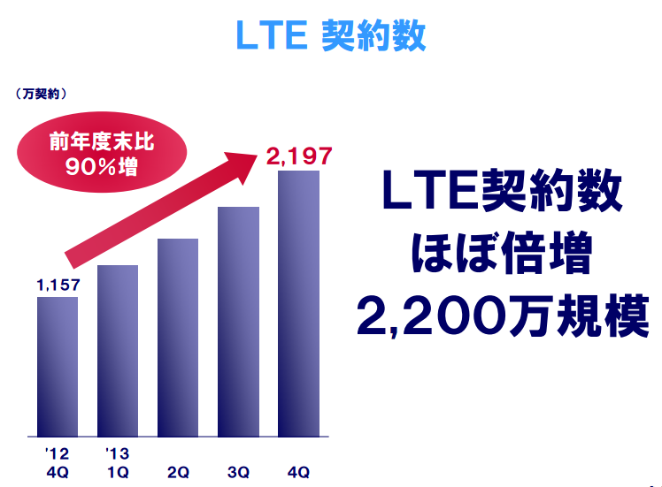 スマートフォン利用数は2013年度末に2435万契約(前年度比30%増)まで増加し、このうちLTE比率は79%(約1924万契約)に増加。2012年度末のLTE比率が47%だったことを考えると、2012年度がLTEスタートとすれば、2013年度はLTEが着実に広がったと言えるかと思われます。