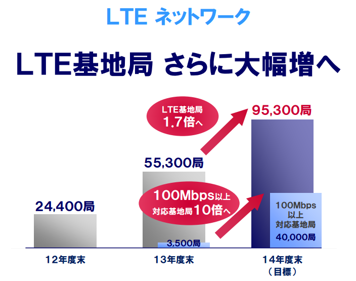 基地局設置については2013年度末に55300局だったのを2014年度末には95300局と1.7倍、また、下り最大100Mbps以上に対応したLTE基地局についても2013年度末に3500局だったものを2014年度末40000局へと10倍に増やす予定だということです。