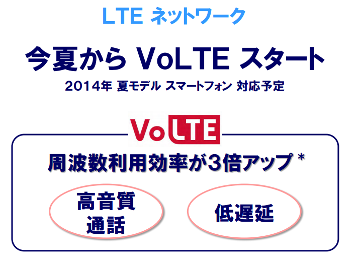 また、すでに発表済みの今夏から開始予定のLTEによる音声通話サービス「VoLTE(ボルテ)」につても紹介されていました。今年5月中旬にも開催される「2014年夏モデル」のスマートフォンで対応予定となっています。