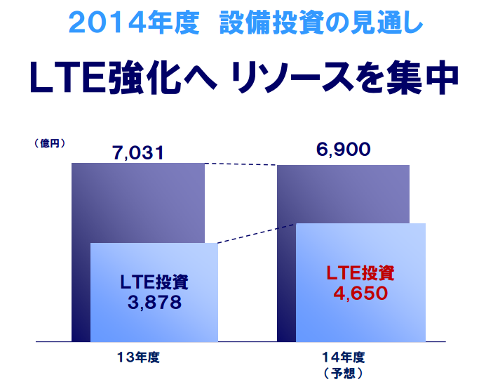 一方で、都市部などでは通信速度が逼迫するなどの課題もあり、さらなるLTE強化へリソースを集中するとのこと。そのため、2014年度設備投資の見通しとしては通期で6,900億円のうちLTE投資が4,650億円と、2013年度のLTE投資3,878億円から増加させるということです。