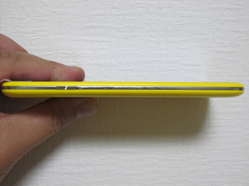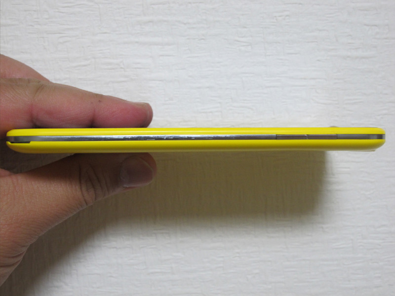 左側面には電源ボタン、右側面には音量キーがあります。どちらのキーも金属製で本体のデザインと一体化したものになっています。