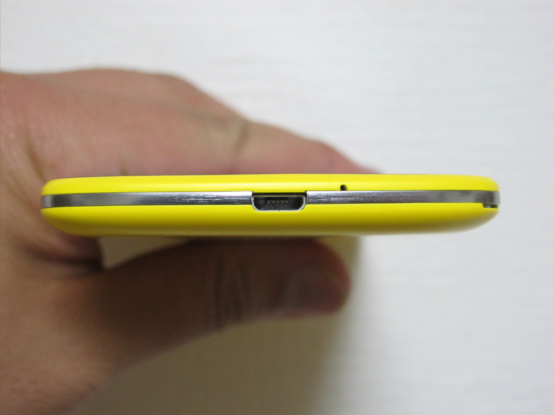 天面には3.5mmイヤフォンジャックが、底面には充電および通信用のmicroUSB端子と通話用マイクのほか、背面カバーを取り外すための爪を引っかけるくぼみがあります。