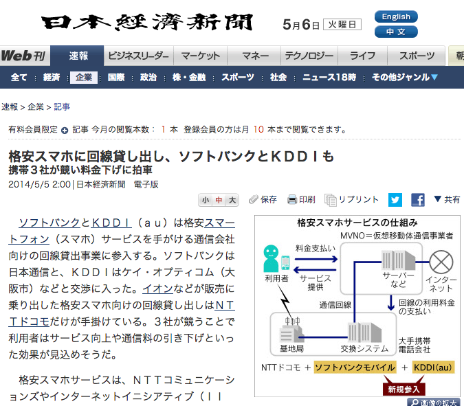日本経済新聞は5日、ソフトバンクとKDDIが携帯電話回線を仮想移動体通信事業者(MVNO)に貸し出す卸売事業に参入すると報じています。ソフトバンクが日本通信、KDDIがケイ・オプティコムなどと交渉に入ったとしています。