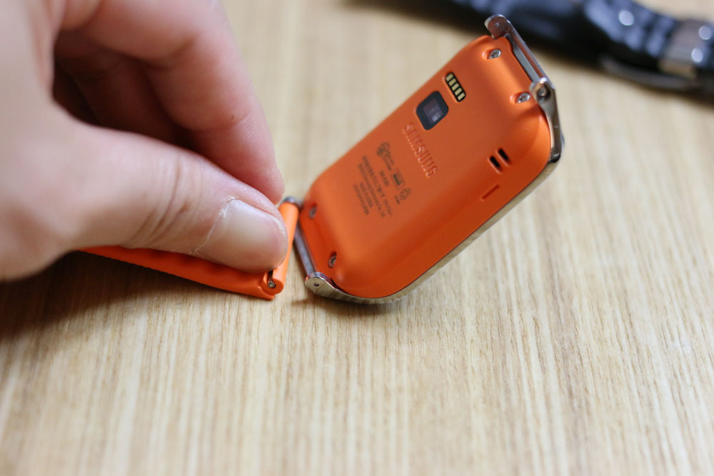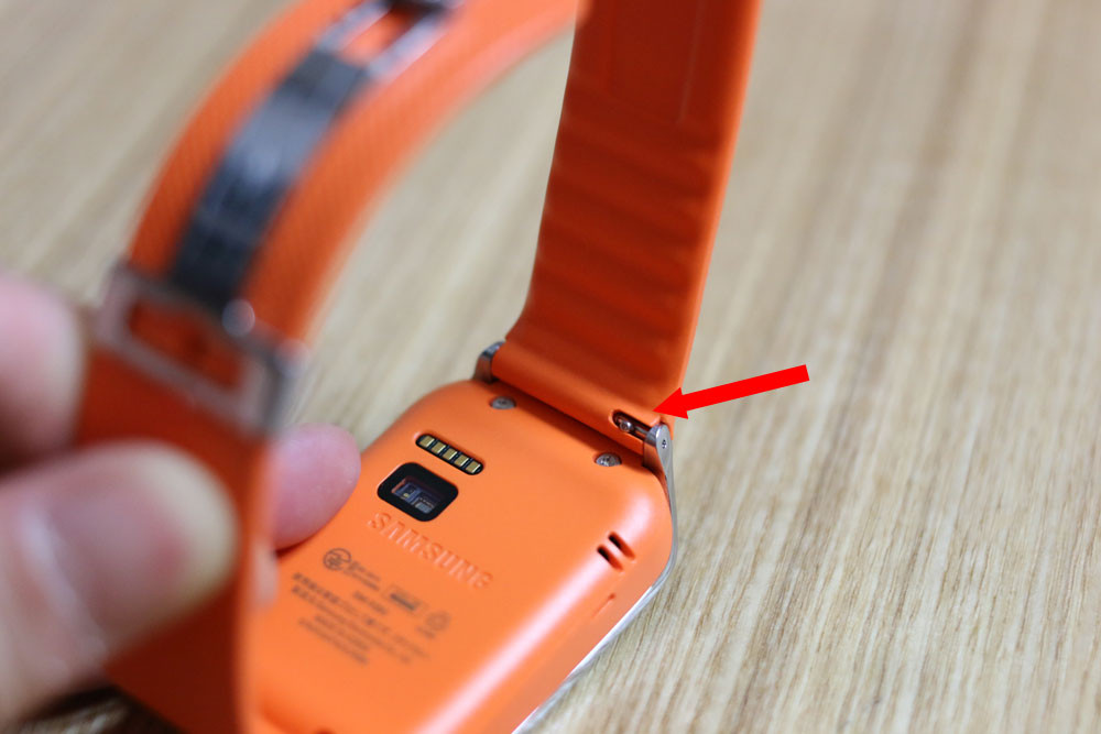 Gear 2の裏を見るとストラップの付け根に突起部分が見えます。この部分はバネになっていて奥に押し込んだ状態でストラップを動かすと外れます。