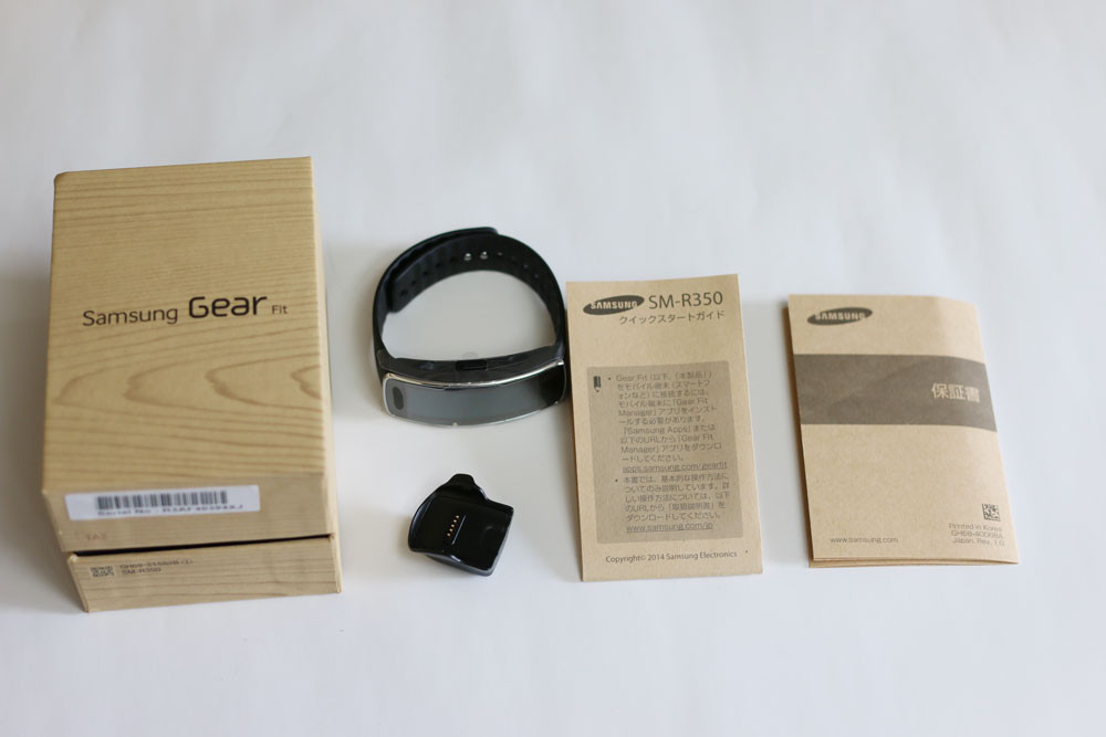 パッケージには、Gear Fit本体および充電用ドック、保証書、クイックスタートガイドが収納されています。