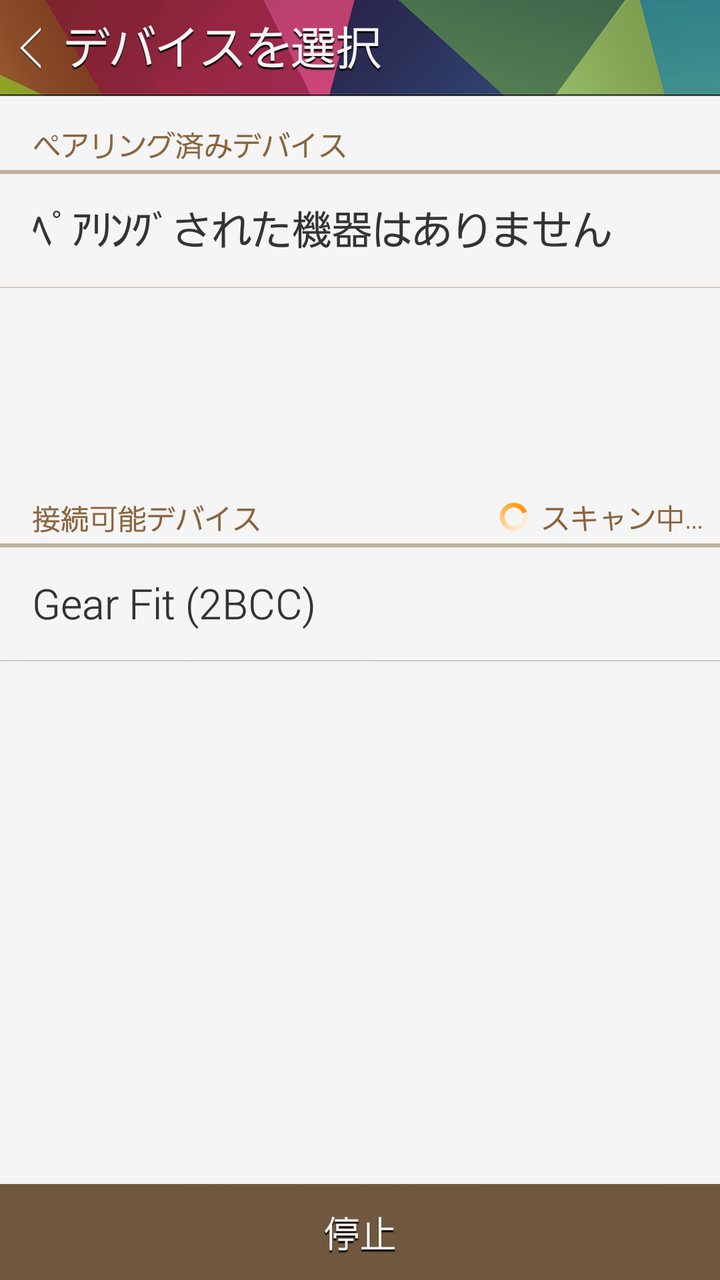 自動的にBluetoothデバイスをスキャンし、接続可能デバイスにGear Fitが表示されます。タップするとペアリングが始まります。