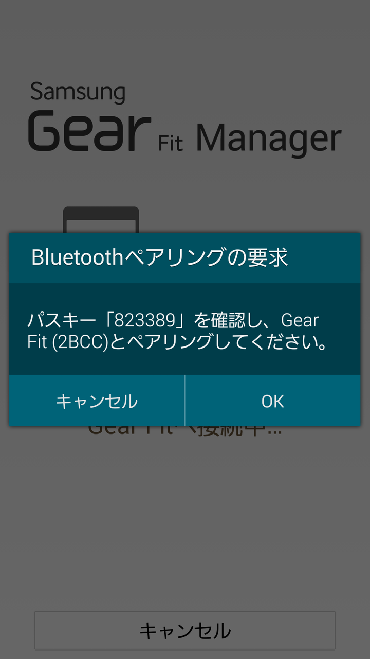 スマートフォンとGear Fitの両方にパスキーが表示されます。同じパスキーであることを確認してチェックマーク、またはOKをタップすると接続が完了します。