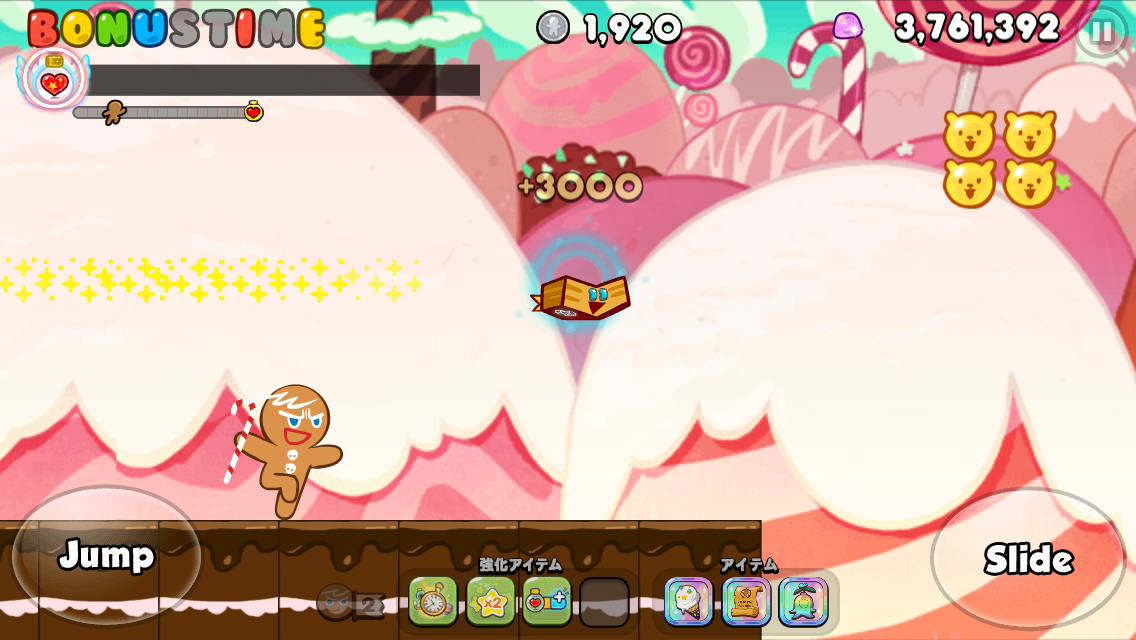 ジャンプとスライディングの2つのボタン操作で、障害物を避けながら、長い距離を走りステージ上のコインやゼリーを多く獲得することでハイスコアをめざします。