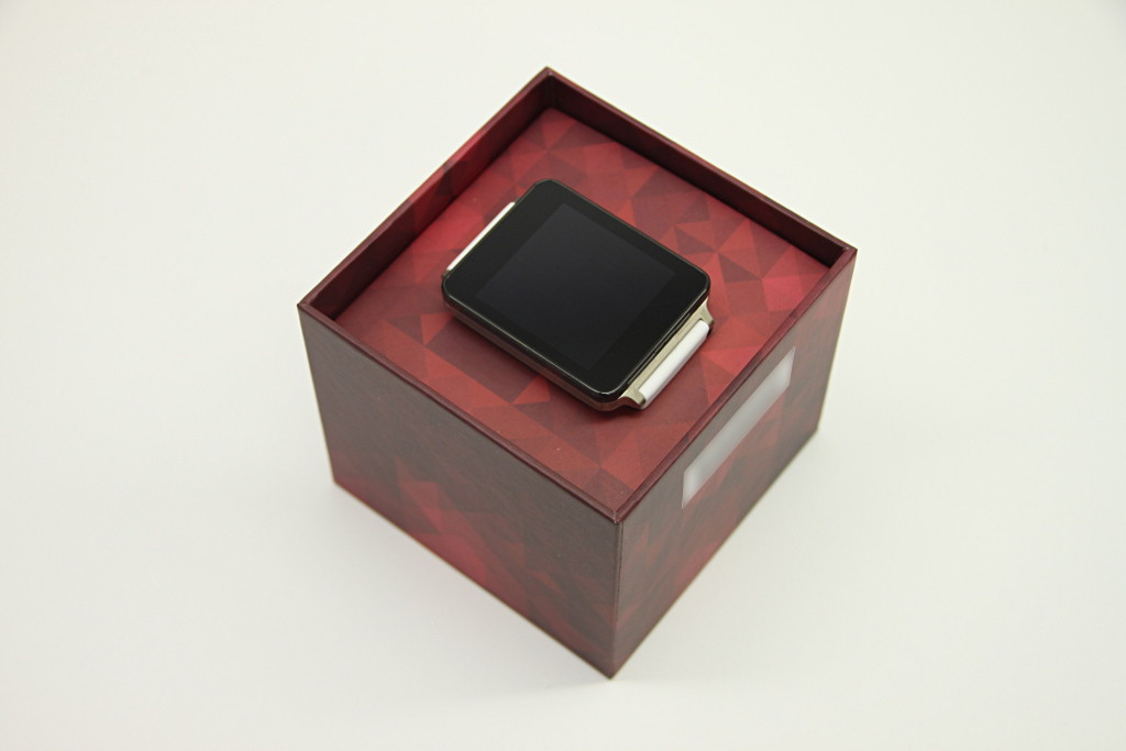 パッケージは時計らしく立方体に近い箱になっています。高級腕時計のようにパッケージ自体にコストがかかっている雰囲気ではありませんが、箱を開けるとG Watchの画面と対面できるなど、パッケージを開封するユーザー体験にも配慮されたものになっています。パッケージに印刷されているAndroid Wearロゴは刷新前のものになっており、ロゴ変更がギリギリのタイミングで行われたことを伺わせます。