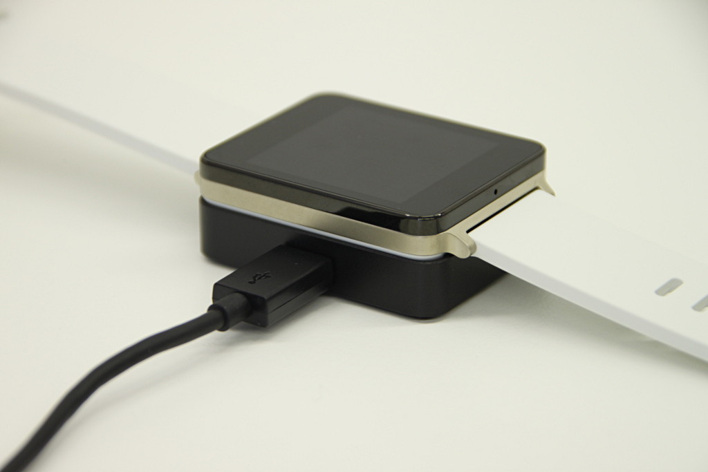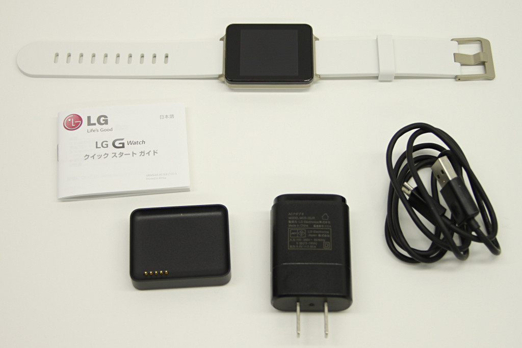 内容物は本体のほかACアダプターとUSBケーブル、充電クレードル、説明書となっています。充電クレードルはmicroUSB端子を備え、G Watchの本体背面に磁石で貼り付けて充電ができるようになっています。ちなみにG Watch本体に電源スイッチはなく、充電クレードルで充電することで電源が入るようになっています。