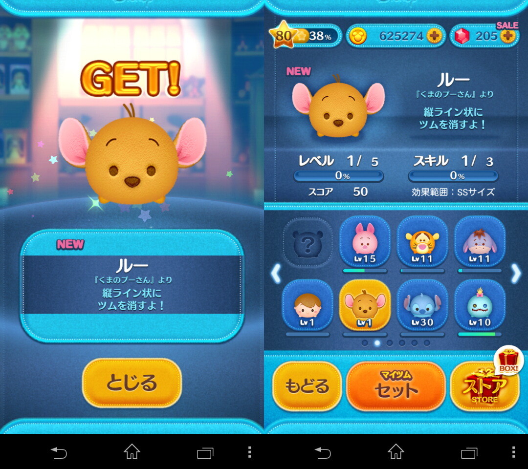 クリストファー・ロビンは「タップで破裂する風船を出現」させ、ルーは「縦ライン状にツムを消す」スキルで、いずれもスキルのレベルは3がMAX。