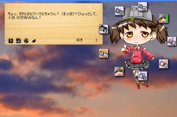 「元気で賑やか」な龍驤はLiplisにピッタリなキャラクターで、表示したまま放置していてもメッセージを表示させながら動きまくる姿は見ていて飽きません。勿論、設定で頻度を変更できるので、自分好みの龍驤ちゃんにしちゃってください。