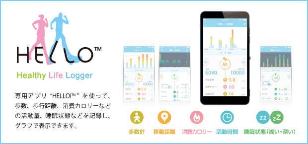 身に付けるだけで1日の歩数や移動距離、消費カロリーなど、さまざまな活動量を簡単に計測・記録することができ、日中の活動量だけでなく、健康維持に必要と言われる睡眠の深さも測ることができます。記録したデータはiOSとAndroidに対応する専用アプリ「HELLO!」をダウンロードすることで管理可能です。