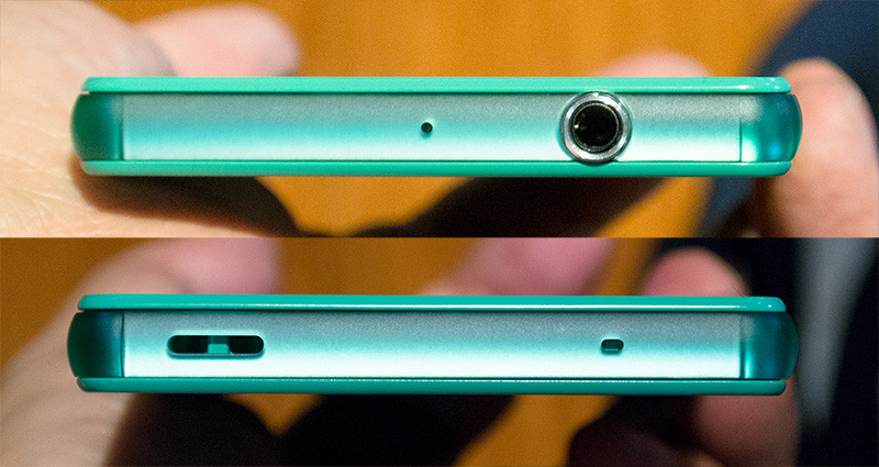 上面にはイヤホンマイク端子(写真=上)、下面にはストラップホールがある(写真=下)