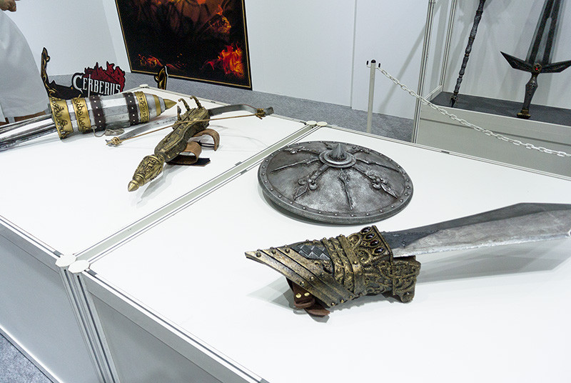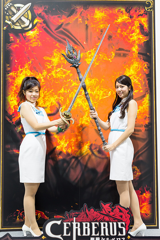 その他、グリーブースには「アイドルマスター」の衣装の展示や、「探検ドリランド」のハルカの衣装展示なども行われている。さらにEXILEが出演する「聖戦ケルベロス」のCMに実際に使われた小道具も展示されており、来場者はこの武器を持って記念撮影が可能だ。