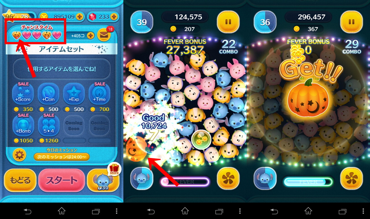 アイテムセット画面(左)、ゲームプレイ中画面(中央)、パンプキンをゲットした画面(右)