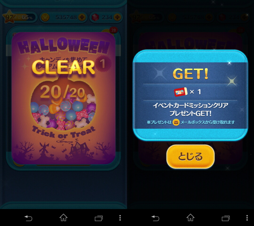 クリア後は、イベントカードミッションクリアプレゼントとして、プレミアムチケットが1枚獲得でき、クリアしたトリック オア トリート1枚目の画面には「金曜日に新しいカードが追加されるよ!」との告知が表示される。