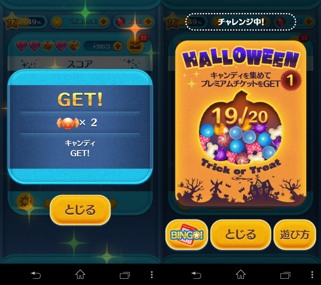 プレミアムチケットを獲得した後のトリック オア トリートの画面(左)とミッションビンゴ再開画面(右)