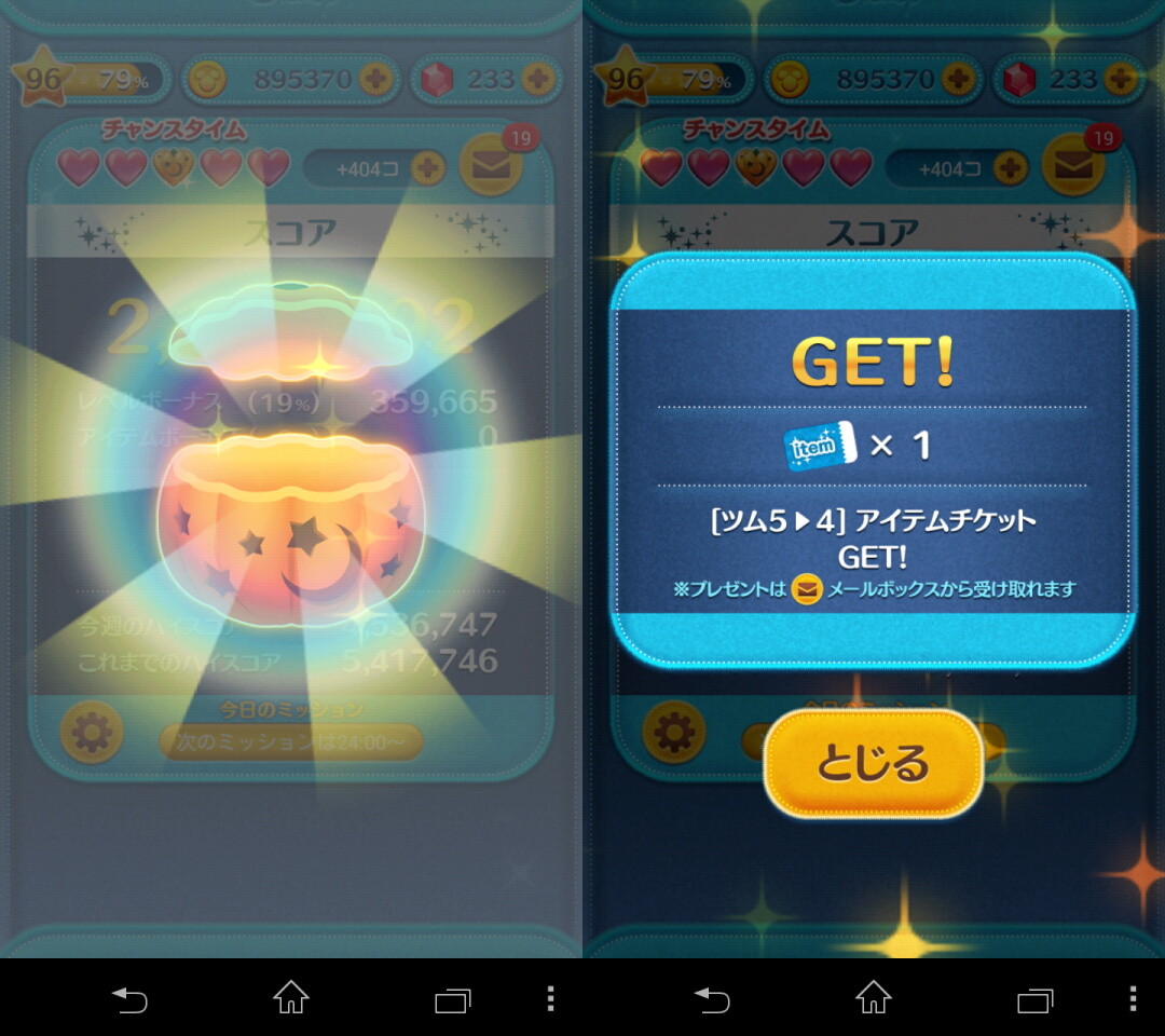 キャンディを20個獲得したクリア画面(左)と プレミアムチケットを獲得した画面(右)