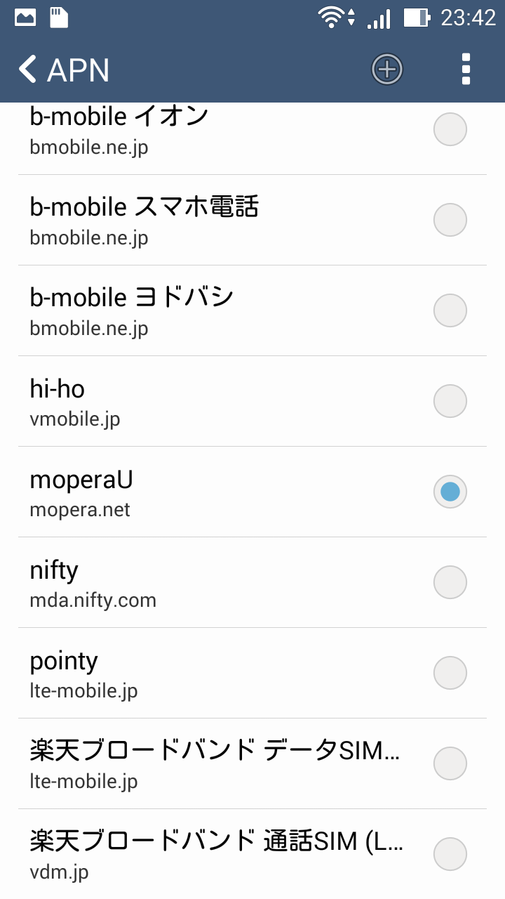 とはいえ、その設定は難しいものではなく初心者でもできる簡単なものだ。ZenFone 5の設定から無線とネットワーク内の「その他」を選び、「モバイルネットワーク」の項目を選択。次に、モバイルネットワーク設定の中に「アクセスポイント名」(APN)という項目があるのでこれを選ぶと、対応しているSIMカードのアクセスポイント名が一覧で表示される。