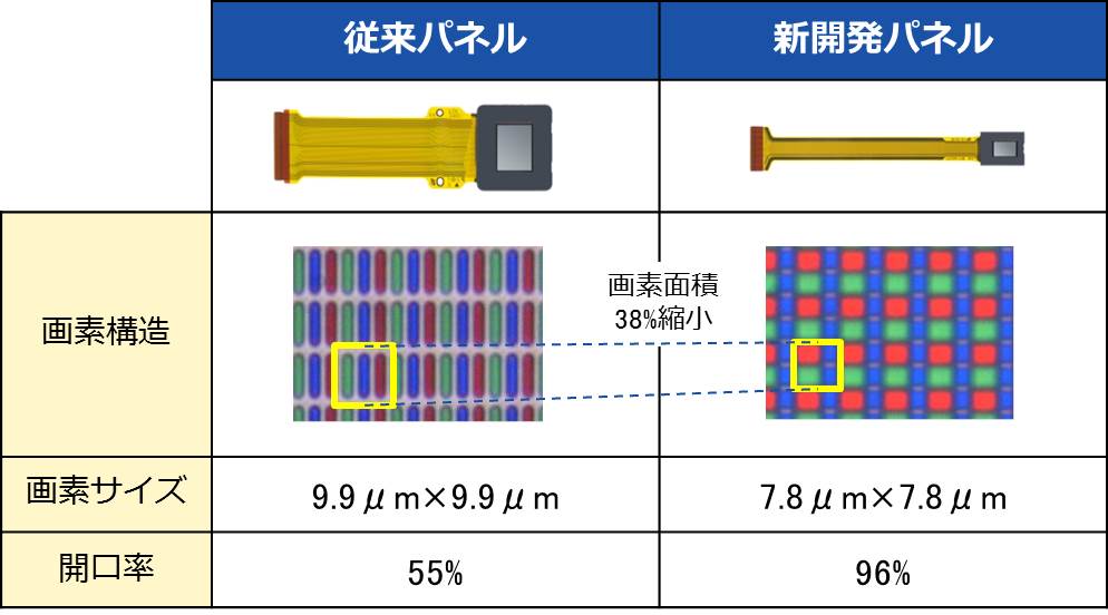 従来パネルでは画素構造において、RGBストライプ配列内に色純度を確保するための遮光部を配置していましたが、新開発パネルでは配列を最適化することで遮光部を最小化し、画素サイズを小さくすると同時に開口率を向上しており、これにより、屋外での使用に必要とされる輝度の維持とパネル外形の超小型化(10.2mm×7.9mm)との両立を実現しているということです。