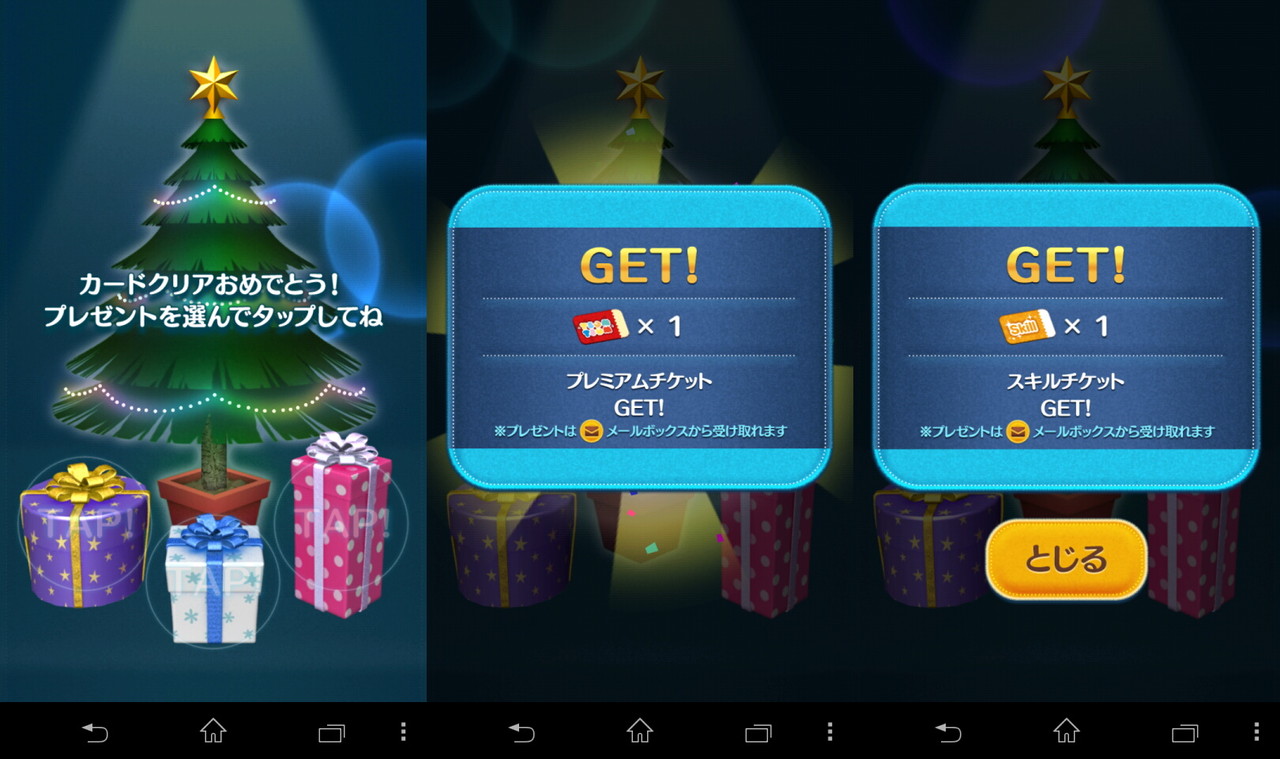 プレゼントボックス選択画面(左)、プレミアムチケットをゲットした画面(中央)、スキルチケットをゲットした画面(右)