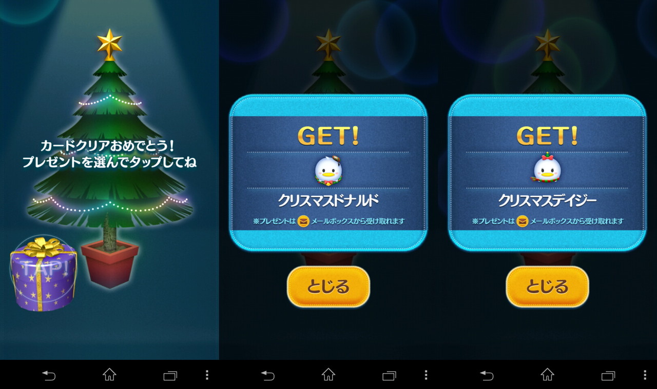 プレゼントボックス選択画面(左)、クリスマスドナルドをゲットした画面(中央)、クリスマスデイジーをゲットした画面(右)