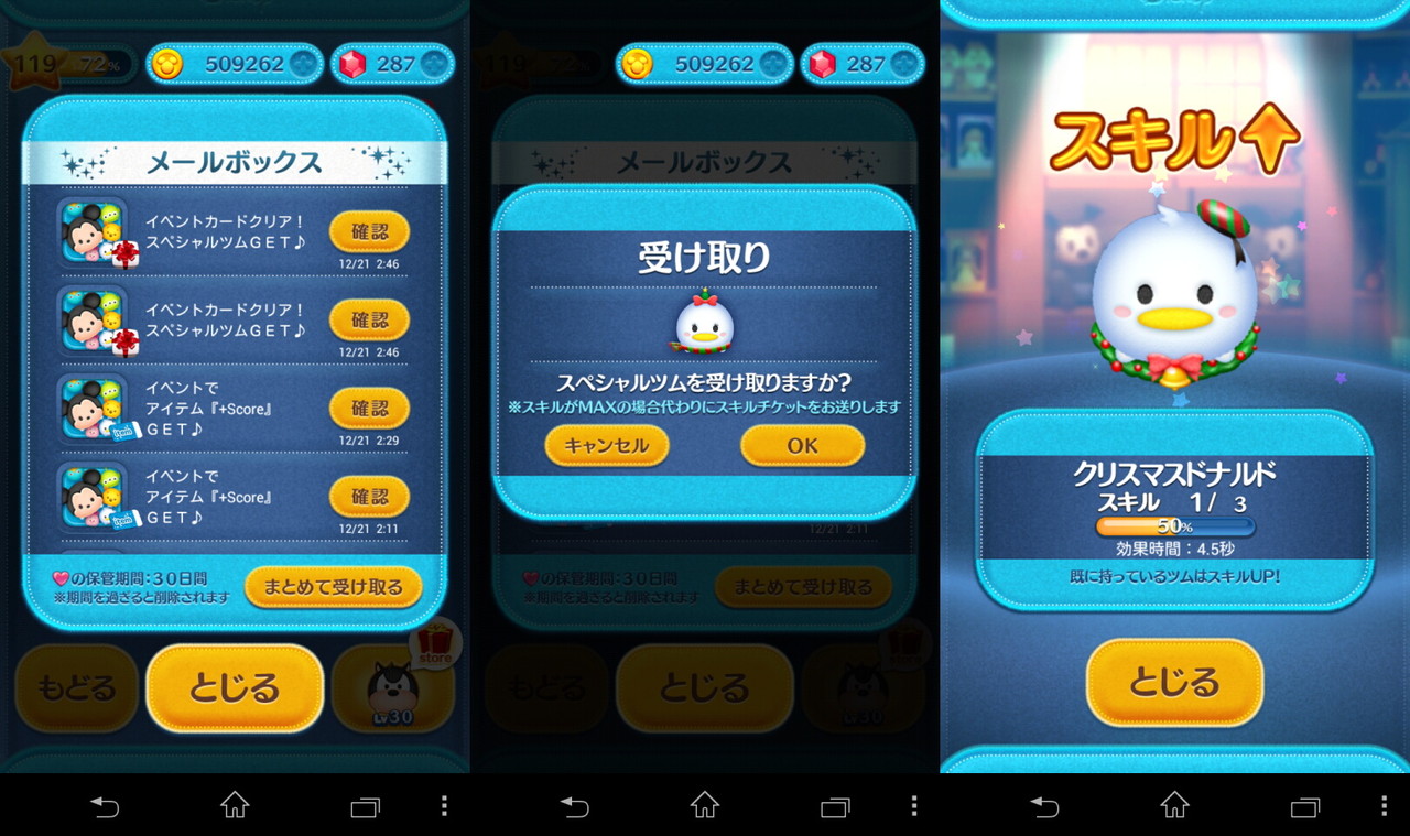 メールボックスの画面(左)、スペシャルツム受け取り画面(中央)、クリスマスドナルドのスキルアップ画面(右)