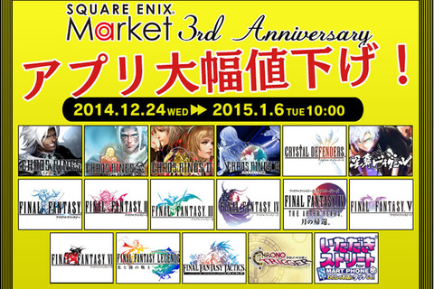 スクウェア・エニックス(以下、スクエニ)は24日、Androidスマートフォン向けコンテンツ配信ポータル「SQUARE ENIX MARKET」にて「3周年記念キャンペーン」の第2弾を2014年12月24日(水)から開始しています。期間は2015年1月6日まで。