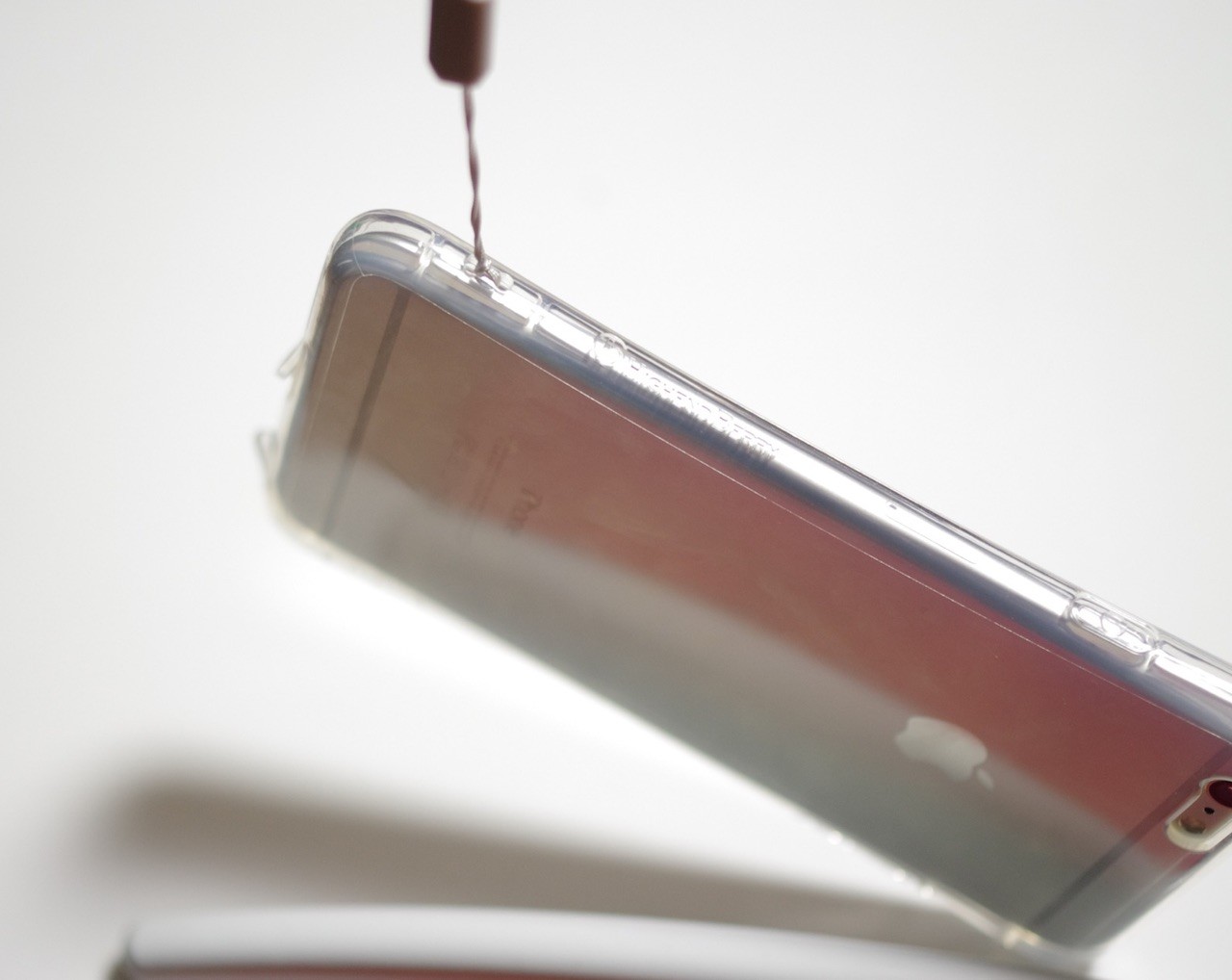 箱および透明ビニールから出し、ケース本体の内側に入れられている保護紙を出したら、iPhone 6 Plusをはめ込むだけです。ケースの素材は曲げようと思えば曲げられる程度の適度に柔らかく透明度の高いクリアTPUを使用しています。また、ケース全体で柔らかさが均一ではなく、しっかり守りたい角の部分は素材が厚く、固くなっていて頑丈というようになかなか良く考えられています。