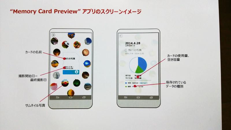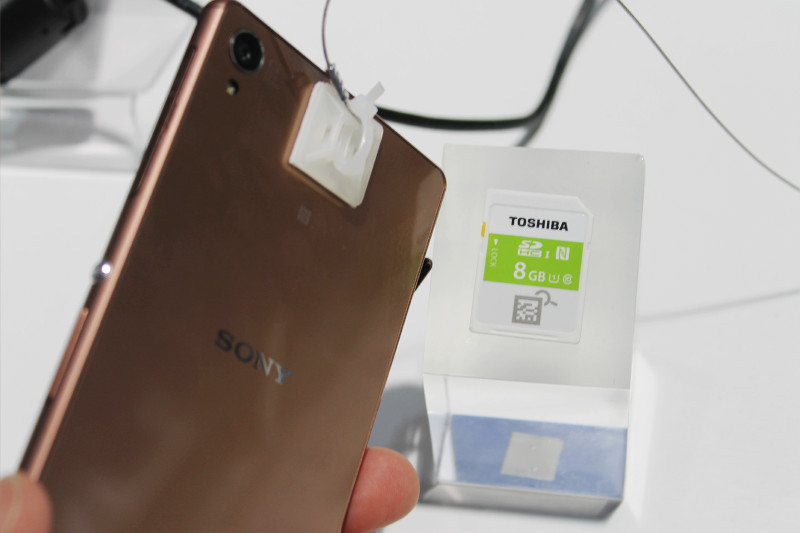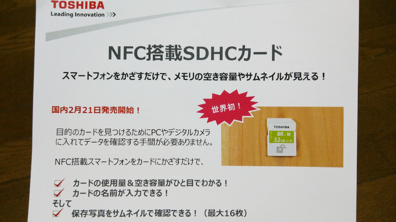 NFC搭載SDHCカードは東芝が開発した世界初のSDカードでその名の通り、専用アプリをインストールしたAndroidスマートフォン(スマホ)のNFCセンサーにかざすだけで、そのメモリーカードの空き容量とフォルダ名が確認できるほか、画像ファイルのサムネイルを取得してスマホ側に表示する機能を持っています。