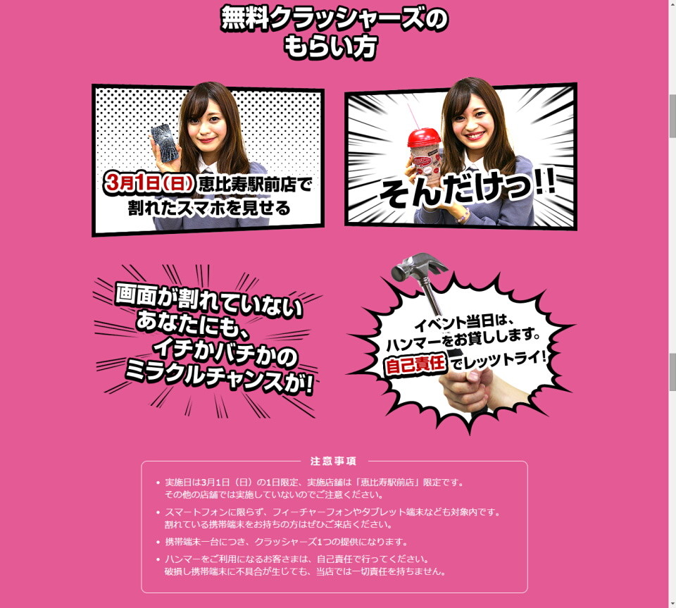 iPhoneやAndroidスマートフォンのほか、タブレット端末や携帯電話(フィーチャーフォン)も対象で、特設サイトでは「あなたのボロッボロのスマホを有効活用できる ミラクル大チャンス!」「割れている携帯端末をお持ちの方はぜひご来店ください」と呼びかけている。